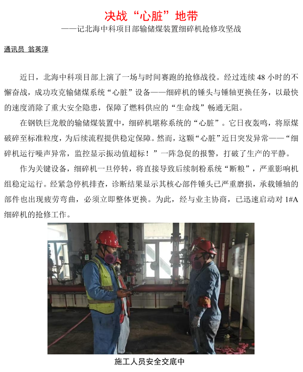 北海中科項目部輸儲煤裝置細(xì)碎機搶修攻堅戰(zhàn)